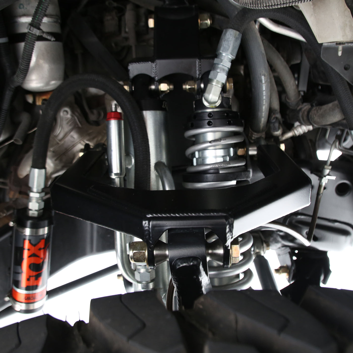 The Dirt King spec bypass shocks were developed specifically for our long travel race kits with a custom tube layout, custom valving, and custom hose lengths. Bypass shocks allow for superior suspension dampening by allowing adjustment of the compression and rebound throughout the shock travel. To fine tune the ride quality a shock tech can quickly make adjustments without removing the shocks from the vehicle. Please note that bypass shocks are noisy due to the steel needle that engages and disengages when fluid bypasses the piston.