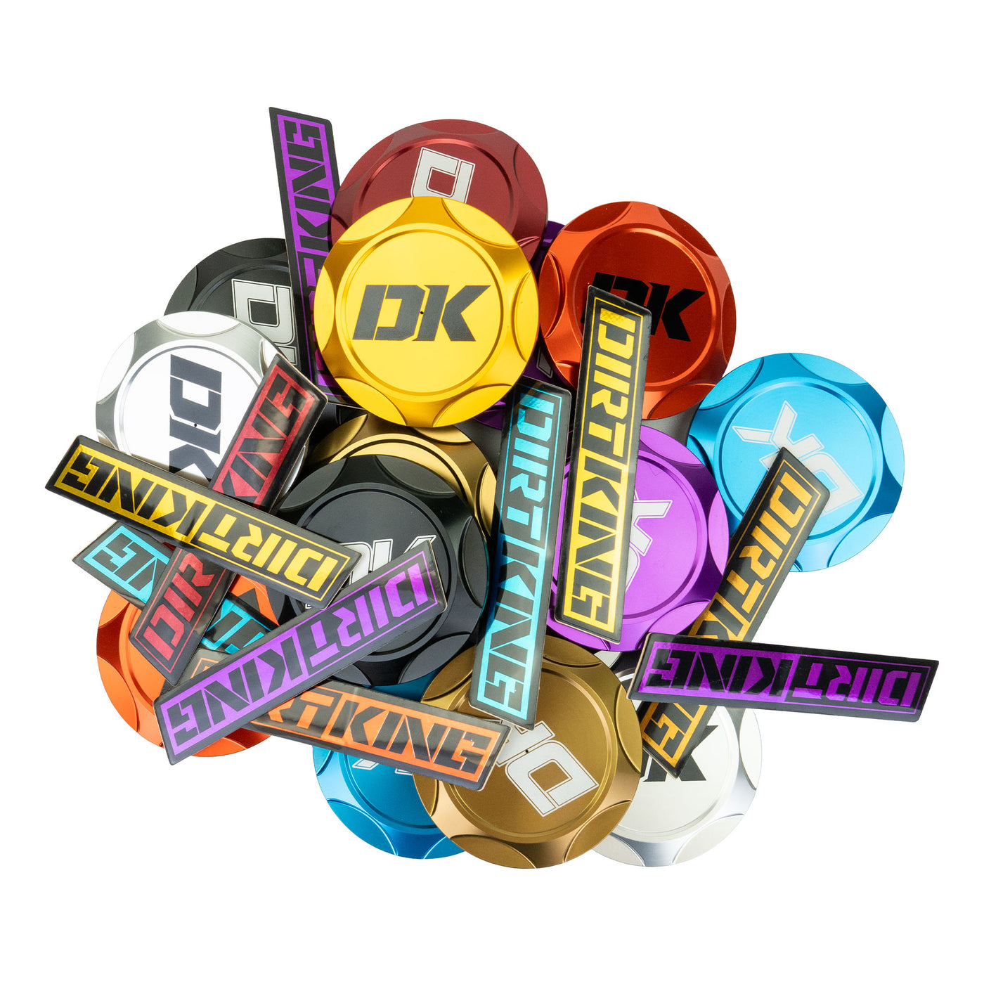 • (2) machined 6061 aluminum caps and (4) Dirt King logo stickers—made from air-release vinyl for maximum adhesion and flexibility around curves.