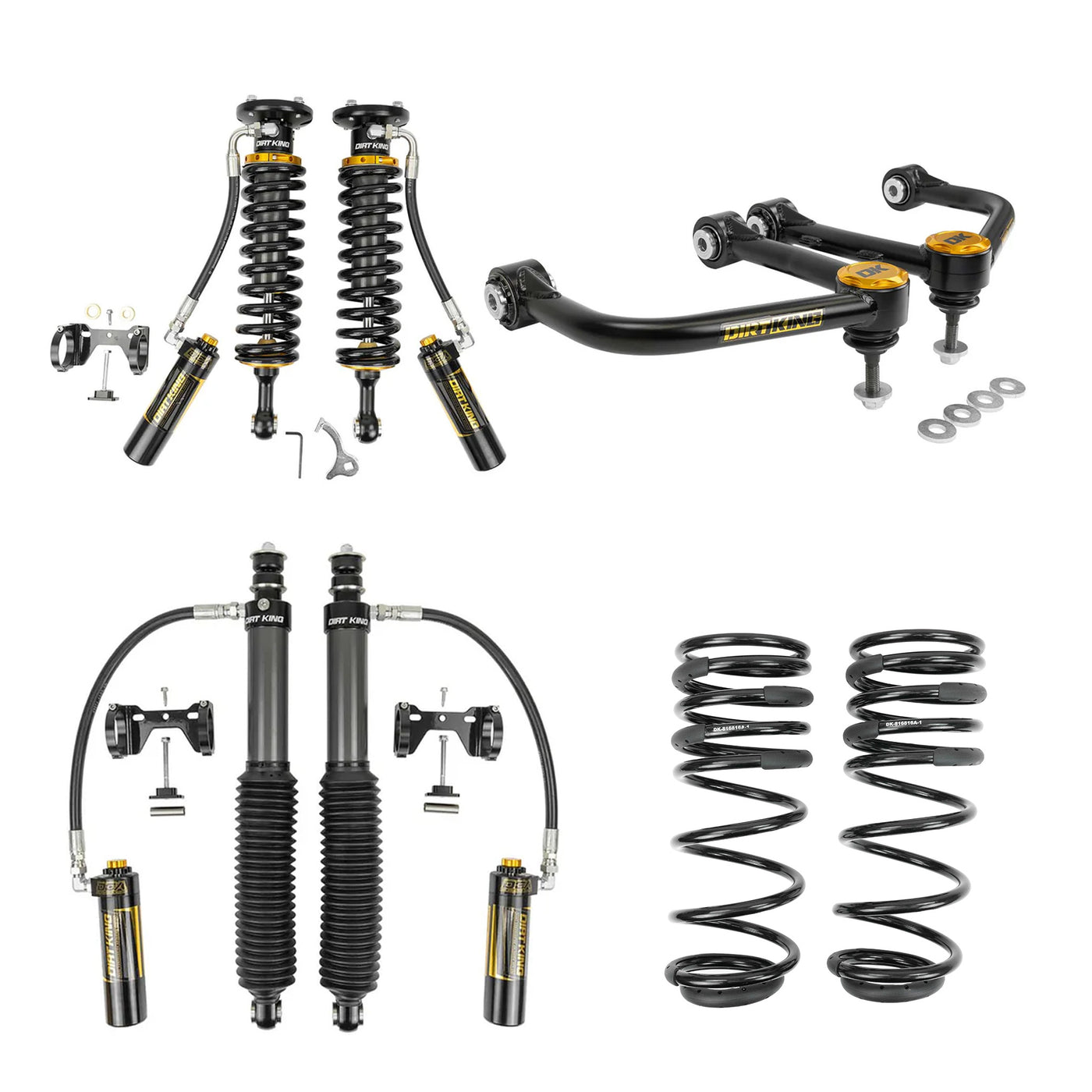 The Dirt King MT Prerunner Kit is a complete suspension package engineered to deliver the ideal blend of aggressive off-road capability and everyday on-road comfort. It includes 2.5" DCA Coilovers, 2.5" DCA Smooth Body Rear Shocks, Multi-rate Springs, and 4130 Upper Control Arms (UCAs)—developed together to ensure the front and rear suspension systems work in perfect sync.