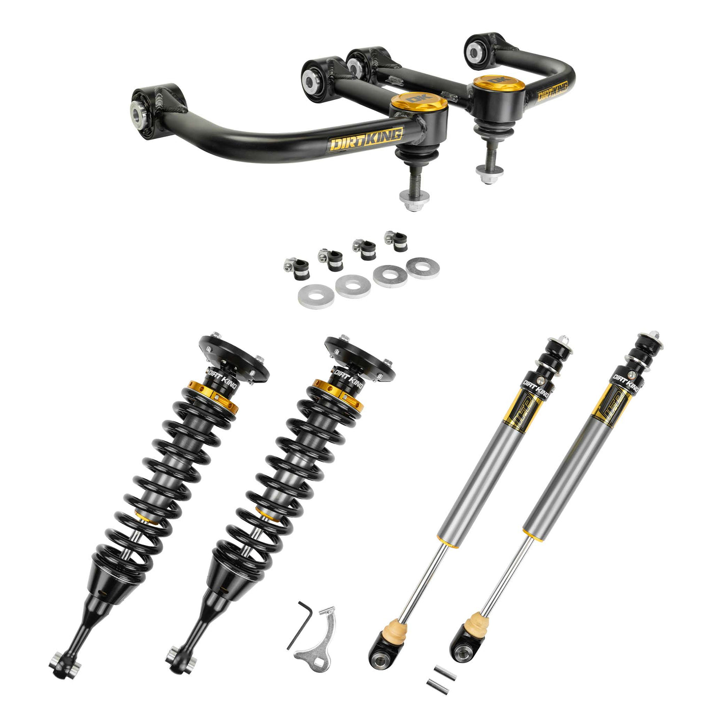 Transform your Tacoma by eliminating front-end rake and achieving a leveled lift with the Dirt King MT Trail Runner Kit. This cost-effective solution includes Dirt King's 4130 Upper Control Arms, 2.0 IFP Front Coilovers, and 2.0 IFP Rear Shocks—all expertly tuned for superior comfort during everyday driving and on rugged trails. It's the perfect choice for those looking to enhance their vehicle's appearance and ride quality without the premium price tag of an extreme off-road package. For unmatched off-road control, adjustability, and high-speed desert capability, consider our MT PreRunner Kit.
