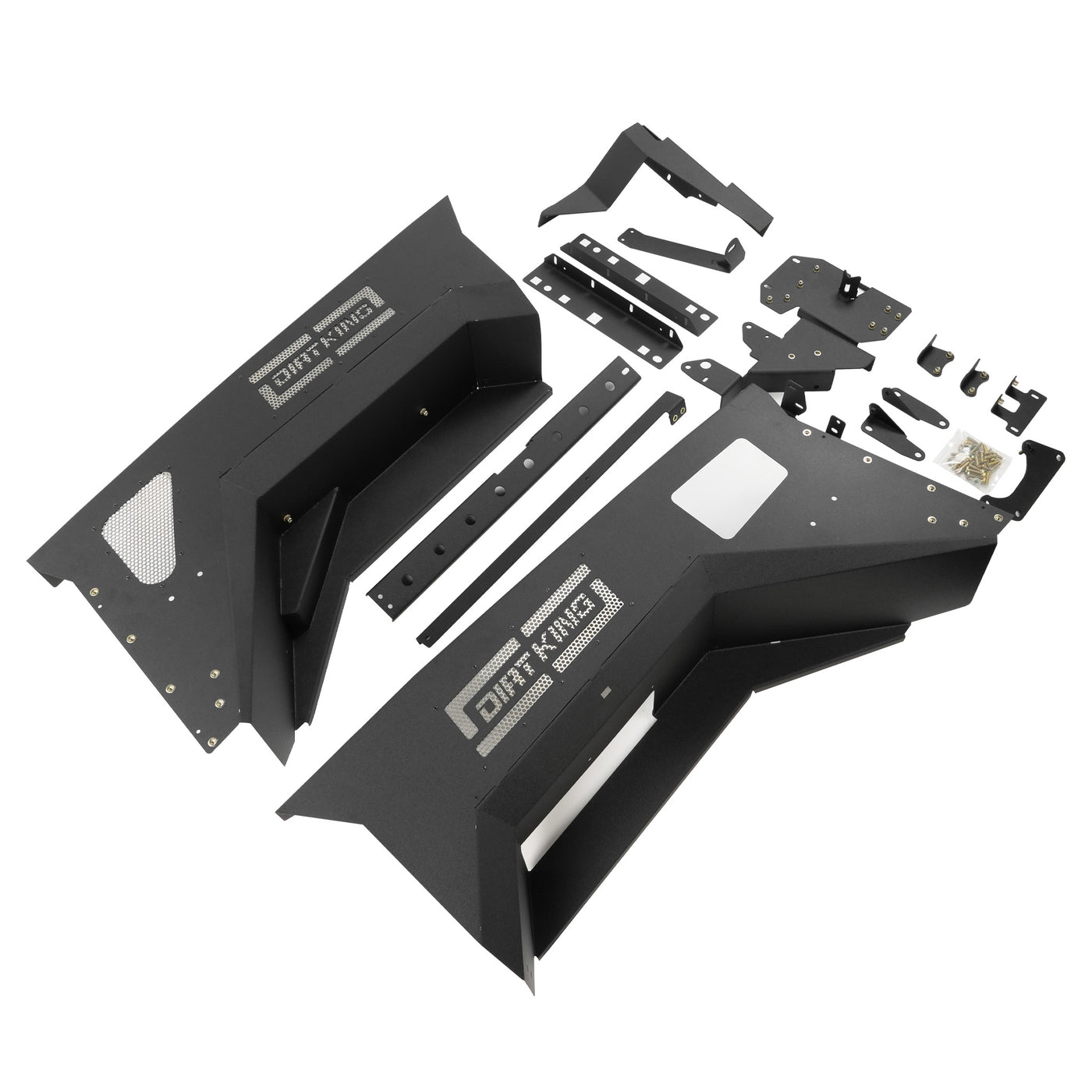 The Dirt King over-sized wheel wells are designed to replace the factory inner fender wells, allowing for proper clearance when 37” tires are installed with long travel suspension. These wheel wells feature a 2.5” larger opening compared to stock and are a complete bolt on application. Everything needed for install is included along with easy step-by-step instructions. In addition, we manufacture an aluminum tank for the windshield wiper fluid that can be purchased separately. The wheel wells are designed for a factory air box, some modifications may need to be made for an aftermarket air box. This product will not work with factory fenders and must be installed with fiberglass fenders.