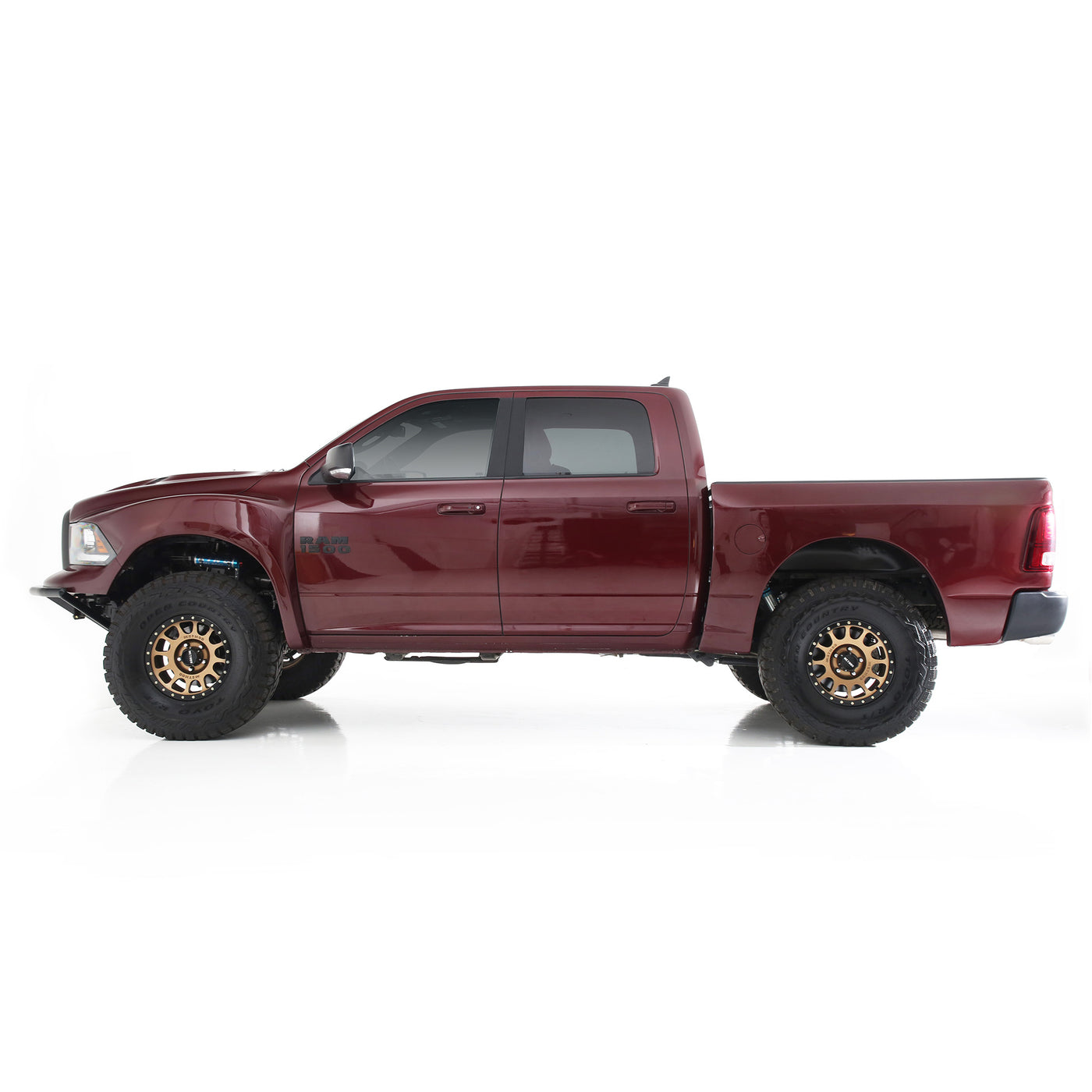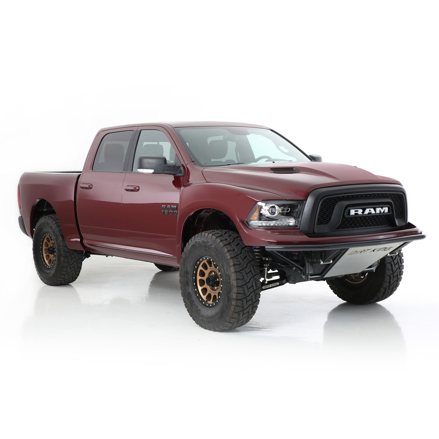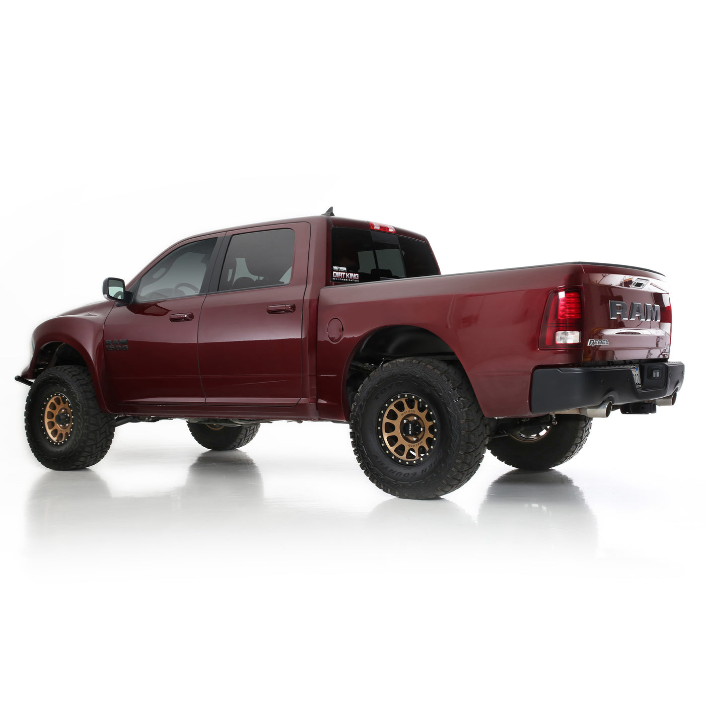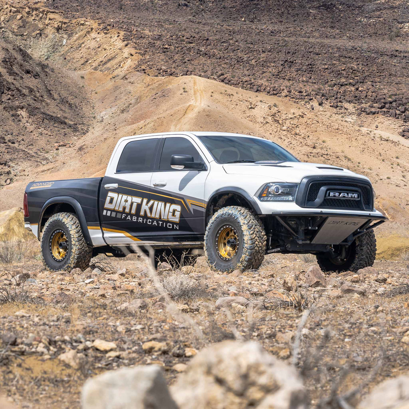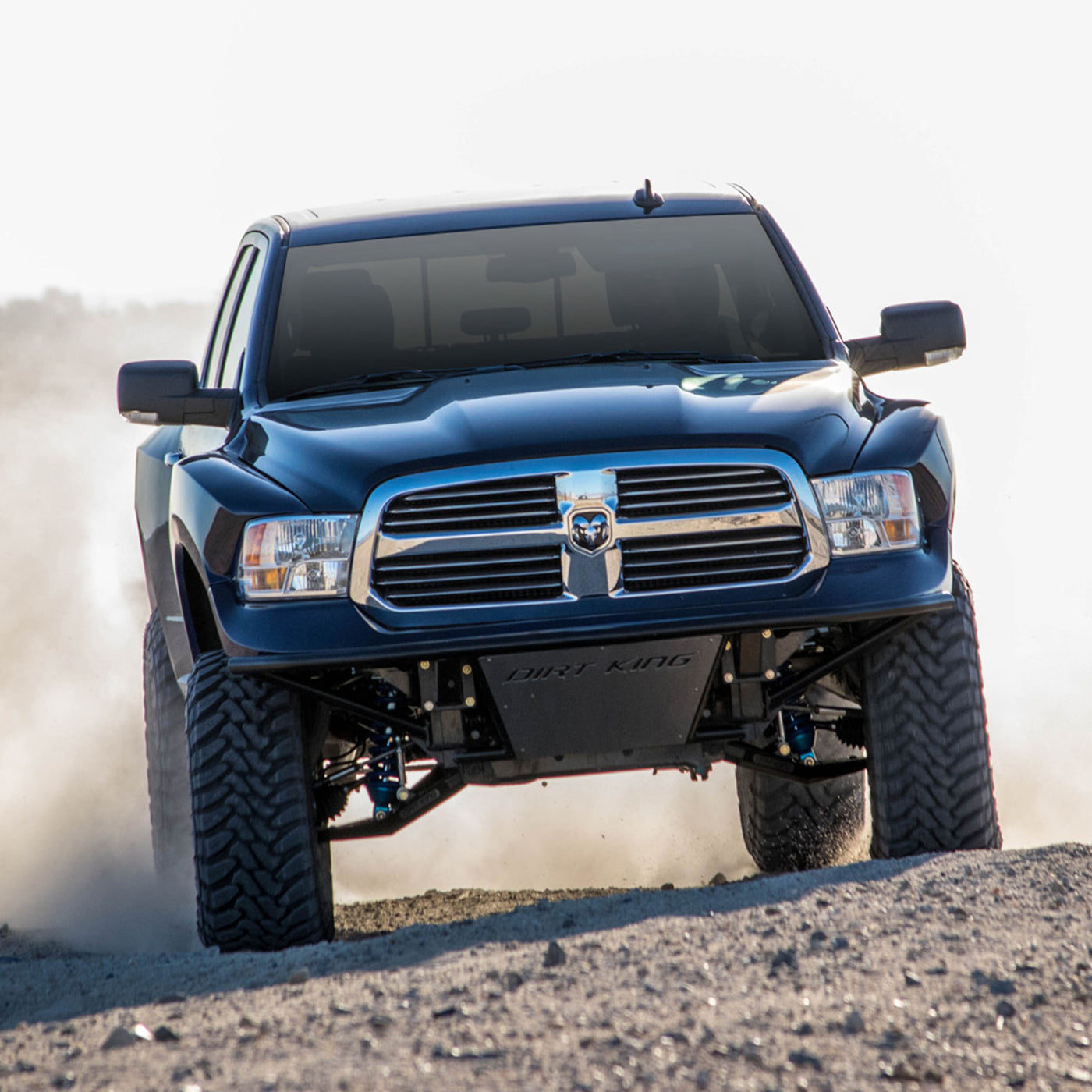 The Dirt King long travel kit was developed to drastically improve the vehicles off-road handling without compromising its day to day driving characteristics. This suspension system allows for 13.5” of travel and accepts up to a 37” tire. The kit is compatible with 2WD models and 4WD models along with the purchase of extended axle shafts. Our upper and lower arms are designed with 1” stainless steel uniballs for the outer pivots instead of ball joints for strength and increased articulation. This kit is the first of its kind, it’s a complete bolt on application with no cutting or welding to the frame on 4WD models. The suspension system was originally developed for Ram Trucks new concept vehicle, the Ram Rebel TRX which was released in mid-2016. After its amazing performance we decided to put the kit in production and make it available to the public!